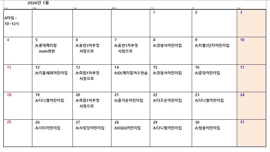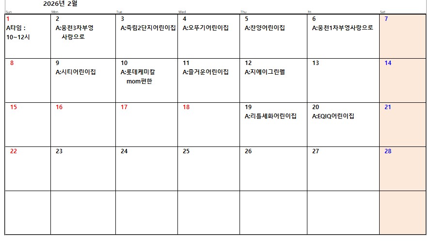 2026년 여수시육아종합지원센터 체험자유놀이실 1월, 2월 단체 예약확정을 알려 드립니다. 아래를 참고 하시길 바랍니다.