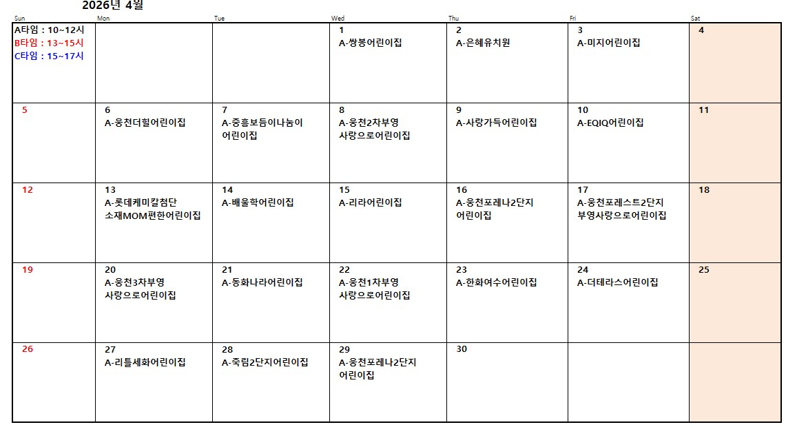 2026년 여수시육아종합지원센터 체험자유놀이실 3월, 4월 단체 예약확정을 알려 드립니다. 아래를 참고 하시길 바랍니다.