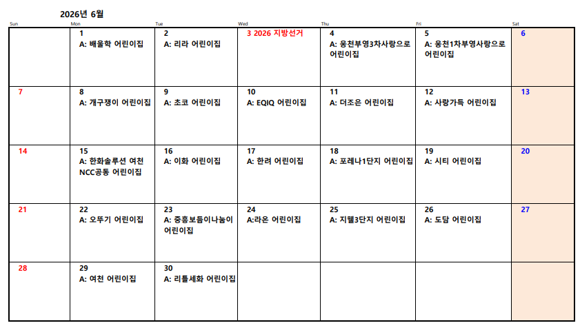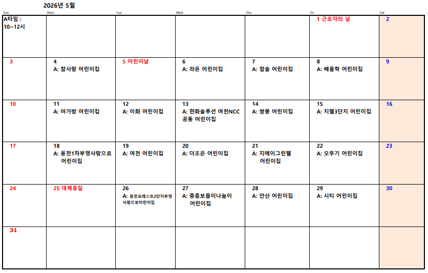 2026년 여수시육아종합지원센터 체험자유놀이실 5월, 6월 단체 예약확정을 알려 드립니다. 아래를 참고 하시길 바랍니다.