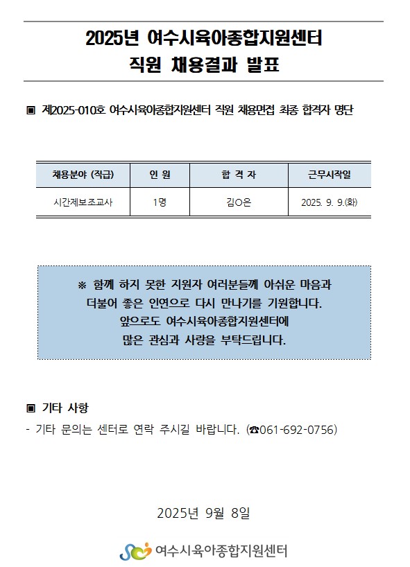 [제2025-010호]여수시육아종합지원센터 직원(시간제보조교사) 채용결과
