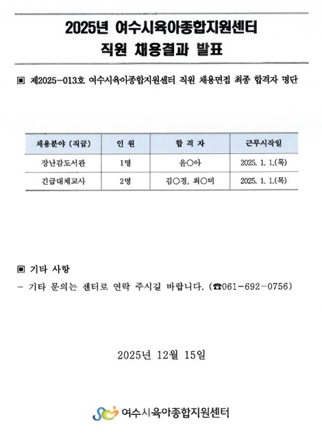 [제2025-013호]여수시육아종합지원센터 직원 채용결과