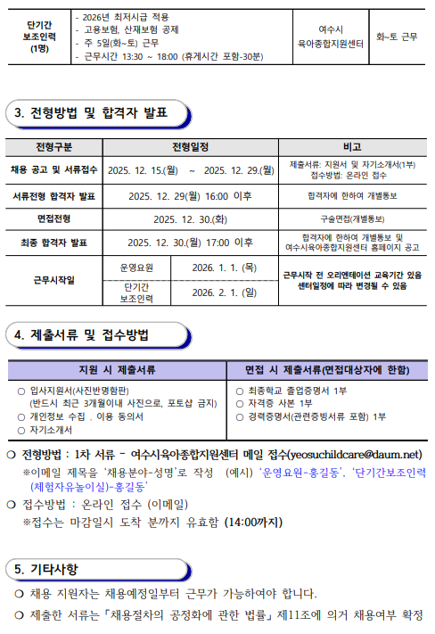 [제2025-017호]여수시육아종합지원센터 운영요원 및 단기간 보조인력 채용공고]