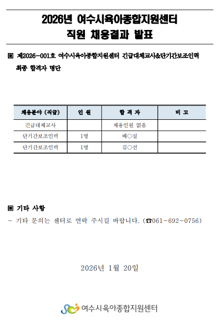 [제2026-001호]여수시육아종합지원센터 직원 채용결과