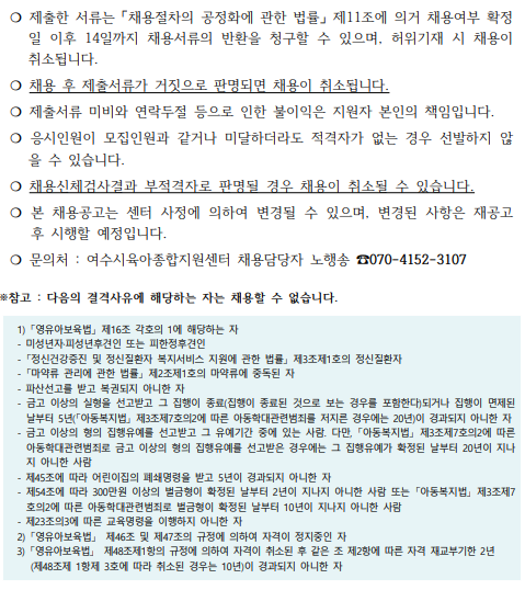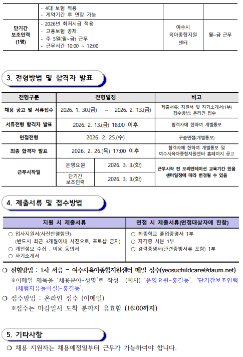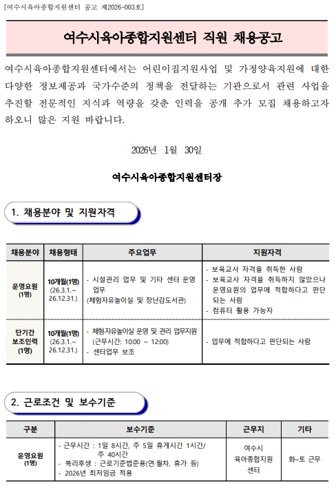 [제2026-003호]여수시육아종합지원센터 운영요원 및 단기간 보조인력 채용공고]...