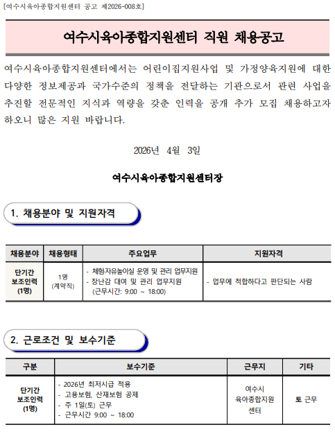 [제2026-008호]여수시육아종합지원센터 직원 채용 공고의 건