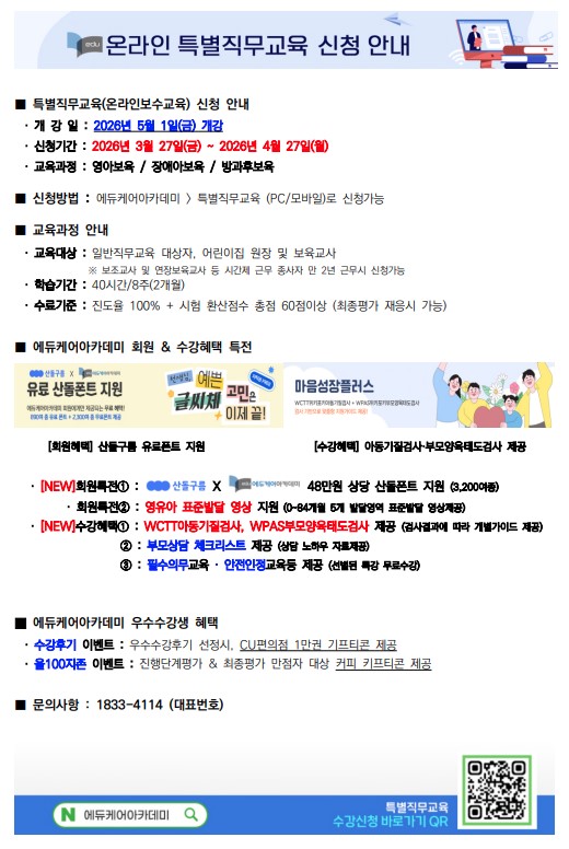 [에듀케어아카데미] 보육교직원 온라인 특별직무교육 2026년 5월 개강 교육신청안내