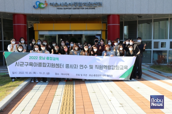 호남·충청권시군구육아종합지원센터 종사자 연수 및 직원역량강화교육에 함께한 참가자들이 여수시육아종합지원센터 앞에서 기념촬영을 하고 있다.