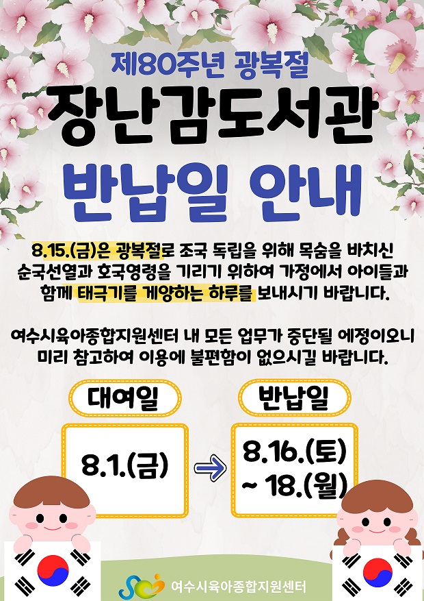 2024년 장난감도서관 8월 공휴일 휴관 및 반납일 변경 안내